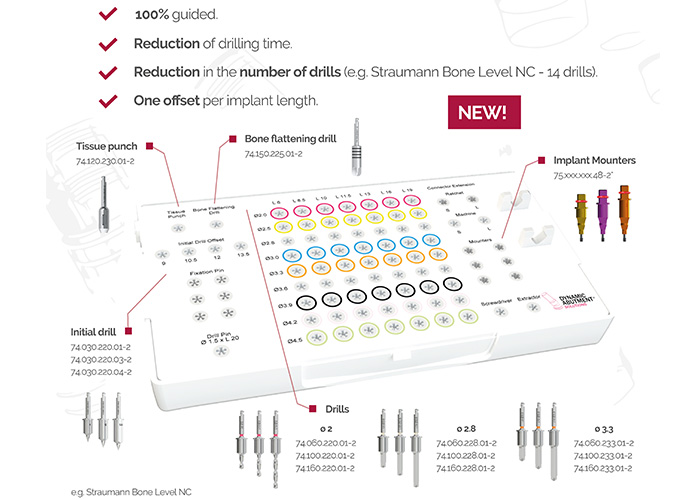 Take your practice to the next level with fewer drills, faster, maximum precision. Ready to simplify surgery? – 100% guided. – Reduced drilling time. – Reduced number of drills (e.g. Straumann Bone Level NC – 14 drills). – One offset per implant length. Simplify your surgical flow without losing precision.