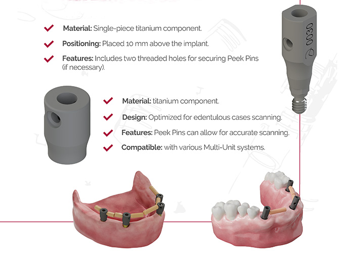 Precision and design in every detail. Our two solutions with the same purpose: more accurate scans and more reliable and durable workflows. Scanbody OP – Made of titanium in one piece. – Placement at 10 mm above the implant. – Incorporates two threaded holes for Peek Pins (if required). Ideal to ensure stability during scanning. Scanbody Reference – Made of …