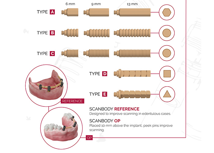 The Scanbody Reference is used for edentulous cases, and the Scanbody OP is placed 10 mm above the implant, which, with the help of the Peek Pins, allows for better scanning.